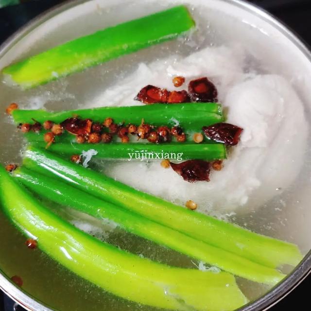 1. 将鸡胸肉1块洗净,大葱1根切成段,生姜1小块切成片;锅里倒入凉水,水烧开后将鸡胸肉放入锅中,加进葱段、姜片、花椒、大料、1小勺盐和1大勺料酒,等水再一次烧开后继续煮1-2分钟后关火;盖上锅盖焖30-40分钟。