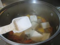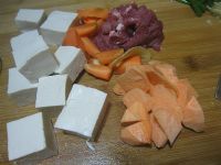 瘦肉红薯豆腐汤的做法 58k美食网 • 2019年7月5日 pm10:09 • 分享, 早点 前段时间回家,妈妈给了一袋红薯,早上煮了一些做早餐,还剩下好多,今天就做了汤。煮过汤的红薯也特别好吃,粉粉的,入口即化。 食材配方 繁体 主料: 豆腐300g 红薯200g 辅料: 瘦肉100g 姜片3片 红萝卜少许 盐适量 做法 共8个步骤 1.准备的材料 2.豆腐切块 3.红薯滚刀切块 4.切好的材料 5.下材料,加入适量的水 6.大火煮开 7.再加入豆腐,煮20分钟 8.下盐调味 小贴士 原创文章,作者:58k美食网,如若转载,请注明出处:http://www.58k.vip/48861.html 发表评论 请登录后评论...登录后才能评论 发表